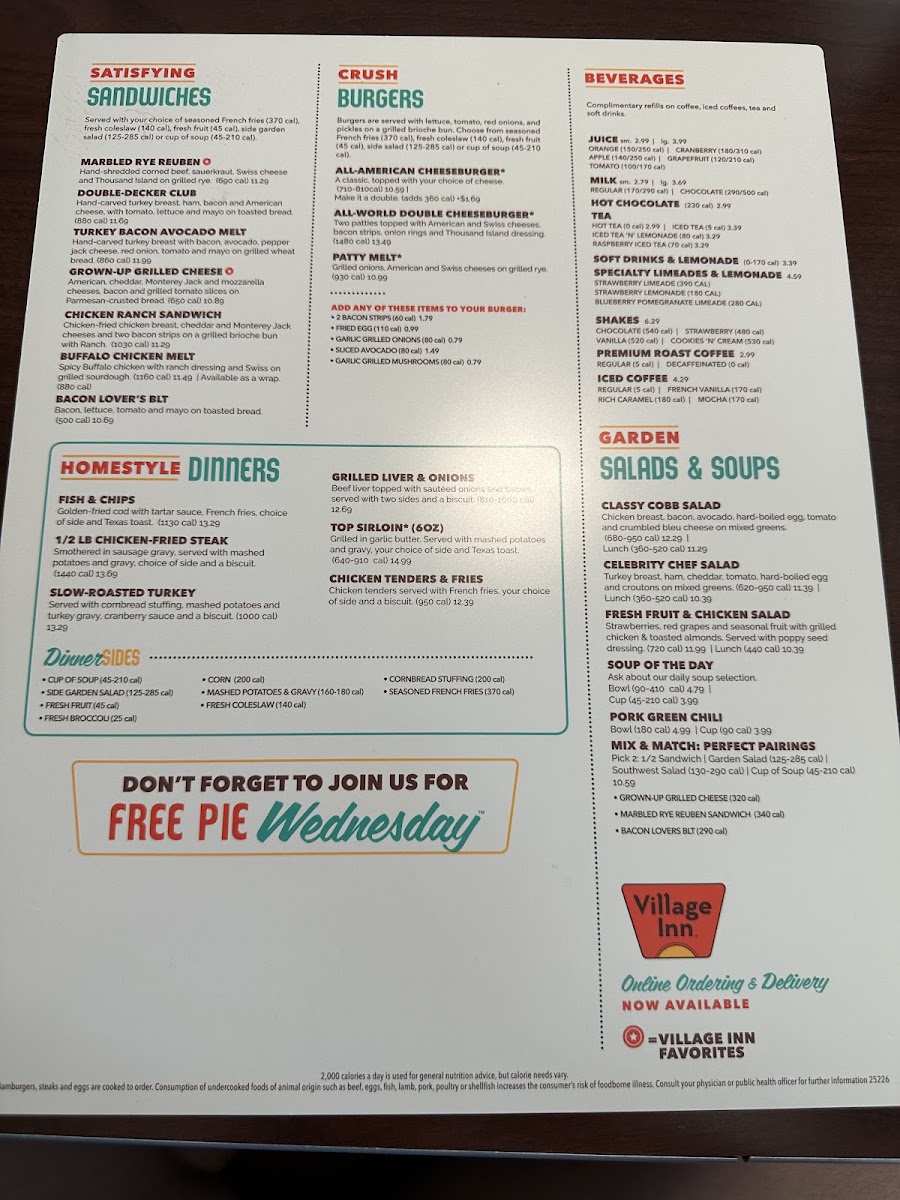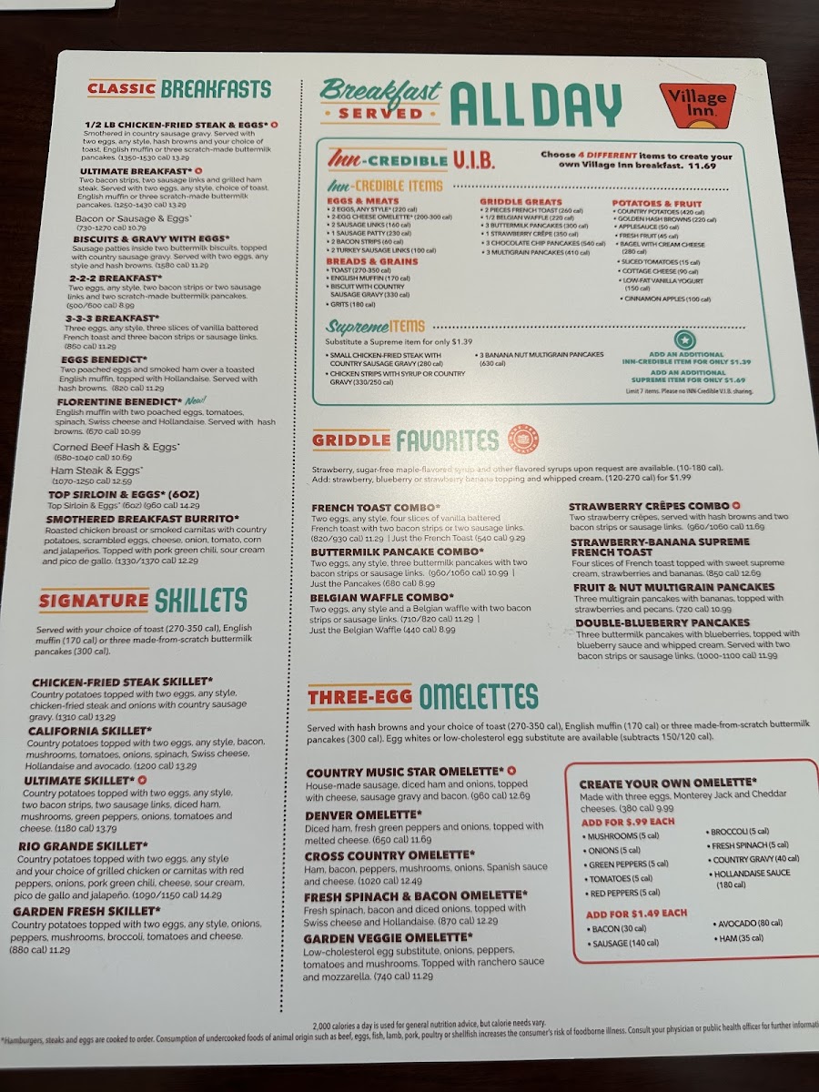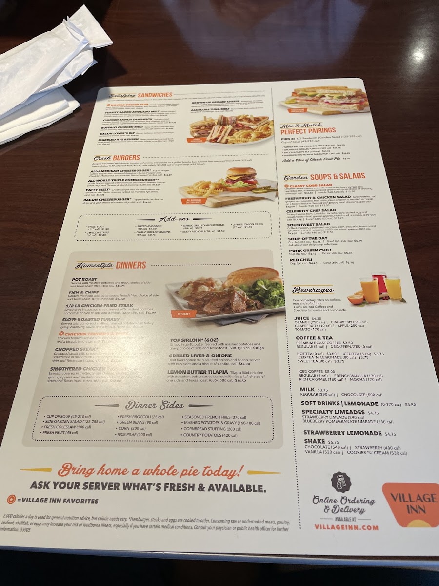 What truly stands out at Village Inn is the balance of home-style flavors with attentive service, creating a personal dining experience. Customers rave about the perfectly cooked breakfast options, emphasizing friendly staff who enhance every visit. Whether you’re seeking a quick, reliable morning meal or a slice of fresh pie in a welcoming family setting, Village Inn’s menu delivers warmth, flavor, and nostalgia all on one plate.